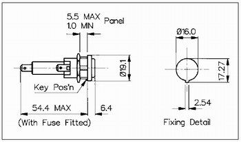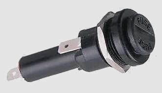 Portafusibles negro para montaje en chasis. Tapa extraíble con destornillador. Utilizado en amplificadores vintage británicos como Marshall®, Hiwatt® y VOX®
